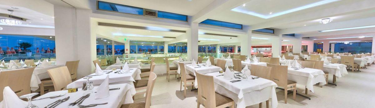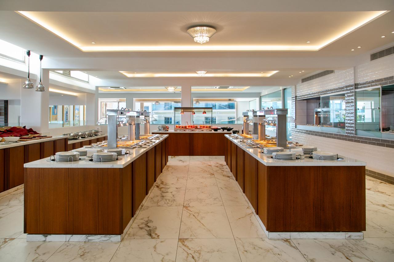 Étkezés: félpanzió, bőségessvédasztalos reggelivel (friss gyümölcsök, pékáruk, hideg és meleg fogások, tojásételek, zöldségek, joghurtok és különféle italok – kávé, tea, gyümölcslevek – teszik teljessé a kínálatot) és büfé vacsorával. Felár ellenében all inclusive ellátás foglalható, benne: reggeli, ebéd és vacsora, délutánonként kávé és tea illetve korlátlan italfogyasztás 10–24 óra között (helyi alkoholos és alkoholmentes italok). Mind a reggeli, ebéd és vacsorák során kiemelt figyelmet fordítanak az ételek minőségére, frissességére, és igyekeznek minden ételallergiát vagy diétás igényt is kielégíteni. Napközben snackek és könnyű ételek, gyorséttermi ételek is elérhetők, valamint jégkrémek, kávé és sütemények a délutáni órákban. Előzetes helyszíni regisztrációval heti egy alkalommal vacsora átjelentkezést a szálloda a’ la carte éttermeibe (Koralli Seafood és Golden Sands Italian Restaurant).